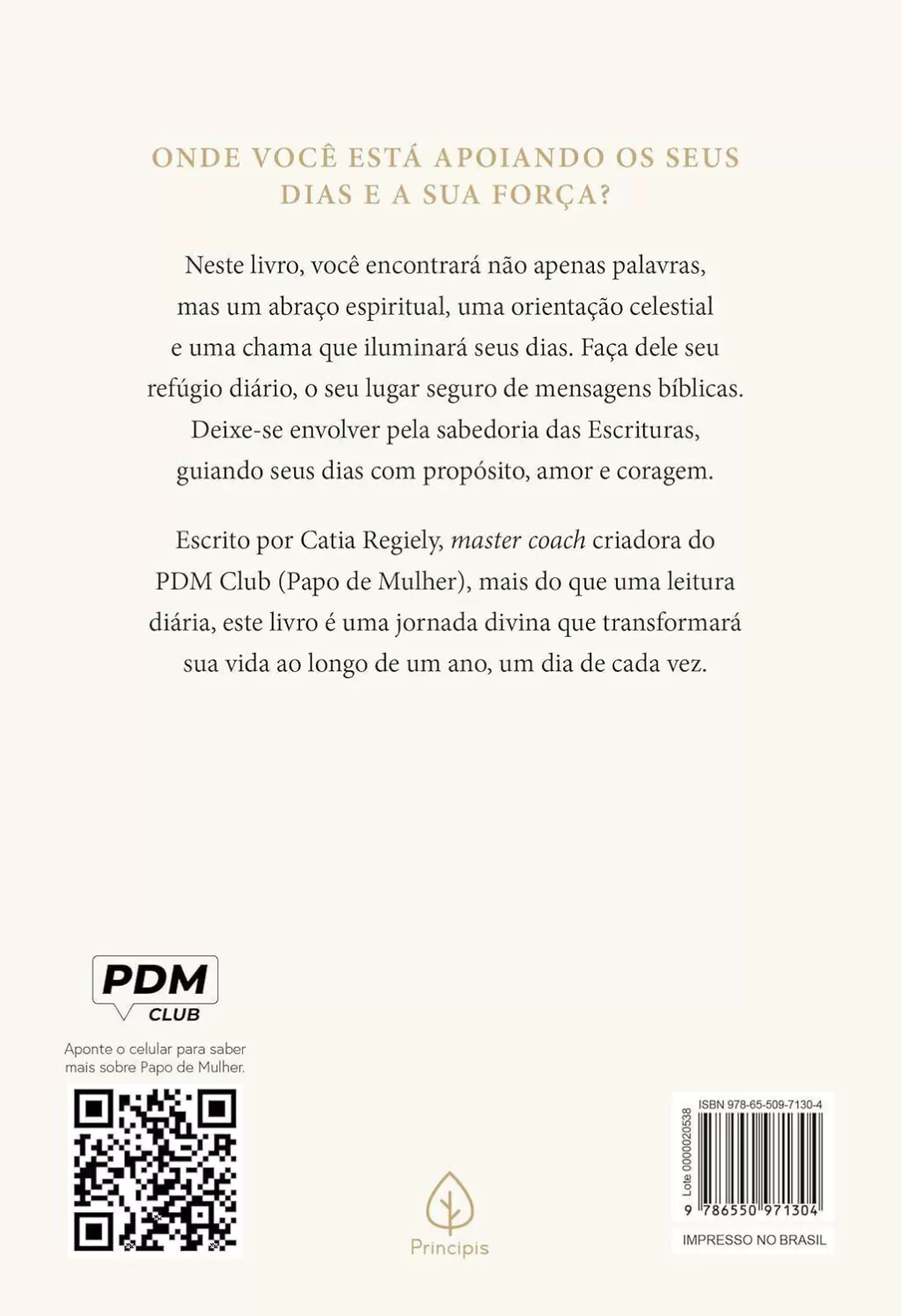 Neste livro, você encontrará não apenas palavras, mas um abraço espiritual, uma orientação celestial e uma chama que iluminará seus dias. Faça dele seu refúgio diário, o seu lugar seguro de mensagens bíblicas. Deixe-se envolver pela sabedoria das Escrituras, guiando seus dias com propósito, amor e coragem. Escrito por Catia Regiely, master coach criadora do PDM Club (Papo de Mulher), mais do que uma leitura diária, este livro é uma jornada divina que transformará sua vida ao longo de um ano, um dia de cada vez.